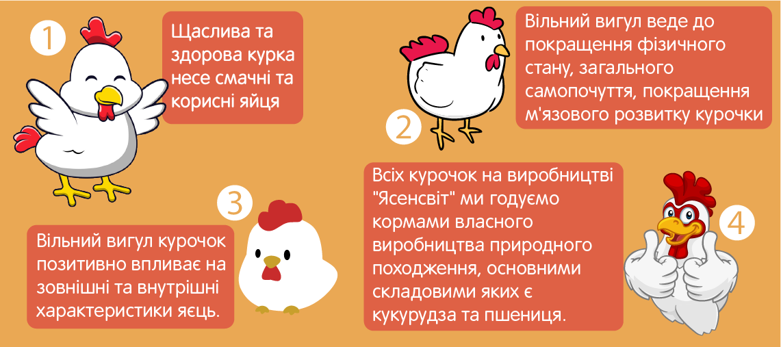 Хотим отметить, что свободный выгул – это способ удержания курочек. Всех курочек на производстве "Ясенсвит" мы кормим кормами собственного производства природного происхождения, основными составляющими которых является кукуруза и пшеница. Также наши корма обогащены витаминами и микроэлементами, они без консервантов и красителей, а значит все куры, независимо от формы содержания, потребляют одинаковое количество питательных веществ. Следовательно, все яйца имеют почти одинаковый пищевой профиль. Но содержание курочек в условиях свободного выгула способствует поддержанию жизненного тонуса курочек в естественных условиях.