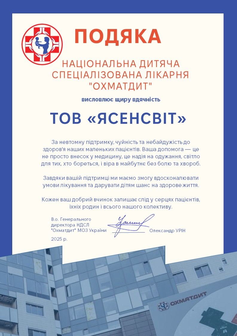Ми отримали подяку від Національної дитячої спеціалізованої лікарні ОХМАТДИТ — за підтримку, турботу та небайдужість до здоров’я маленьких пацієнтів.